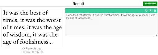 After a few seconds, your image and the extracted text should show up on the screen. For most tools, they show up side by side. You can adjust any discrepancies here (if there are any) and then copy or download your text.