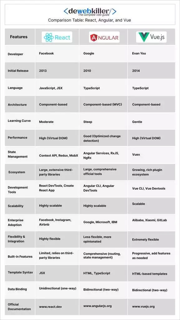 • Angular is best for developers seeking a comprehensive, all-in-one framework for large-scale applications.