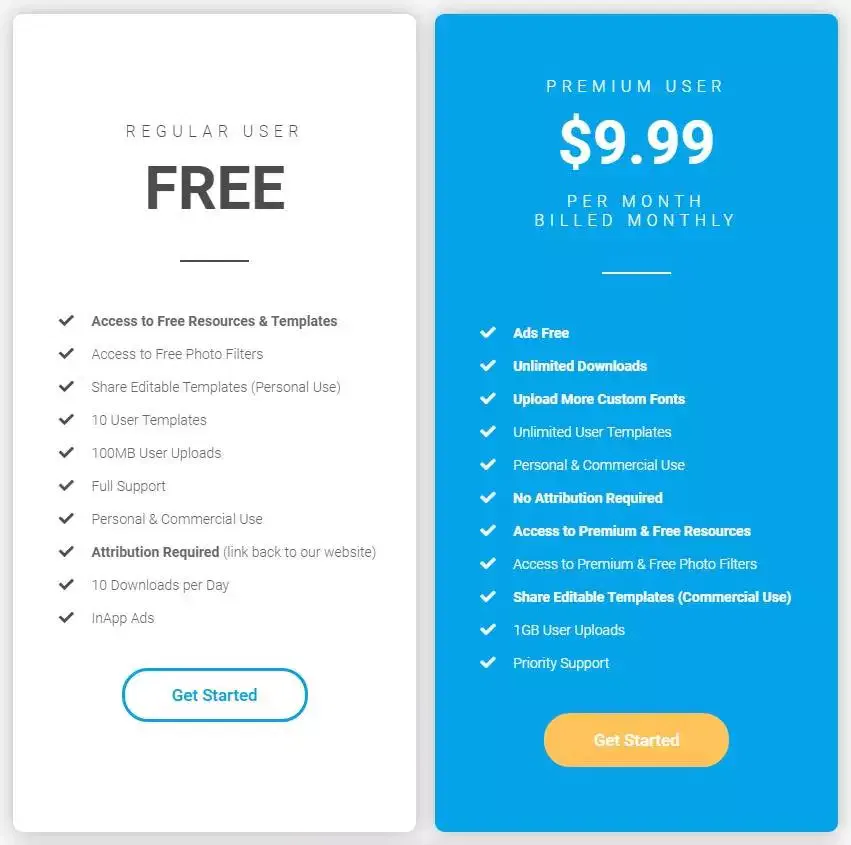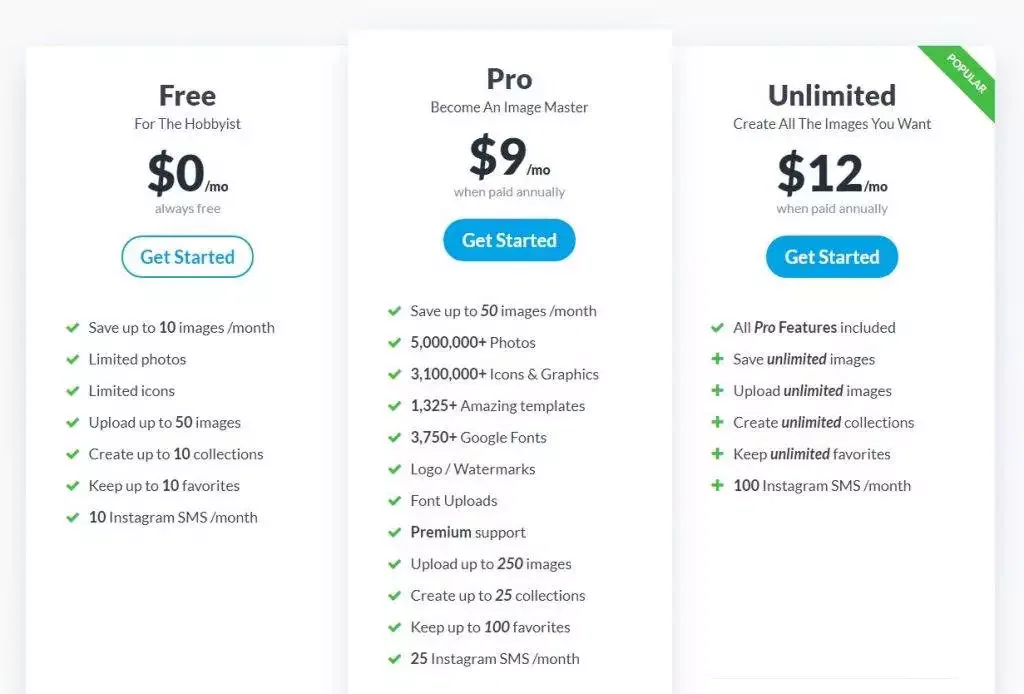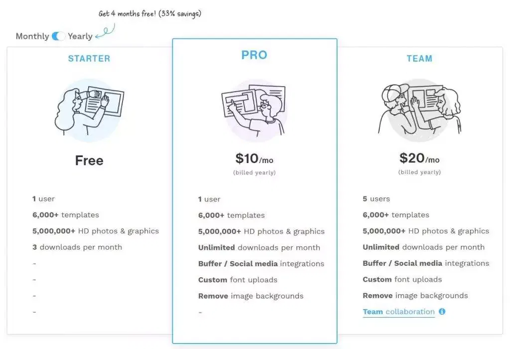 Among all these list, Snappa is the only one whose free plan and paid plan has same templates, graphics, images, and other design resources. The limitation is that you can only download three designs a month but you can check what template you’re using. As in the canva there are also may templates for the effects, icons, and graphics and stock photos. Once you are happy with what you have created you are good to go like download or share you post in the social media.