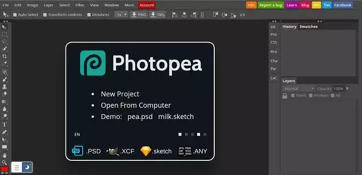 Photopea in the online photo editor, advanced image editor. It supports psd, xcf, sketch, XD and CDR Format (Photoshop, GIMP, Sketch, Adobe XD, CorelDraw). For those who want to quicky edit the photo and create stunning banner and social media post from right in your browser it can be the alternative for the photoshop and XD and other photo editing tools. It has the similar freature like: Photoshop, GIMP, Sketch, Adobe XD, CorelDraw and the best part is, it also supports their file extension.
